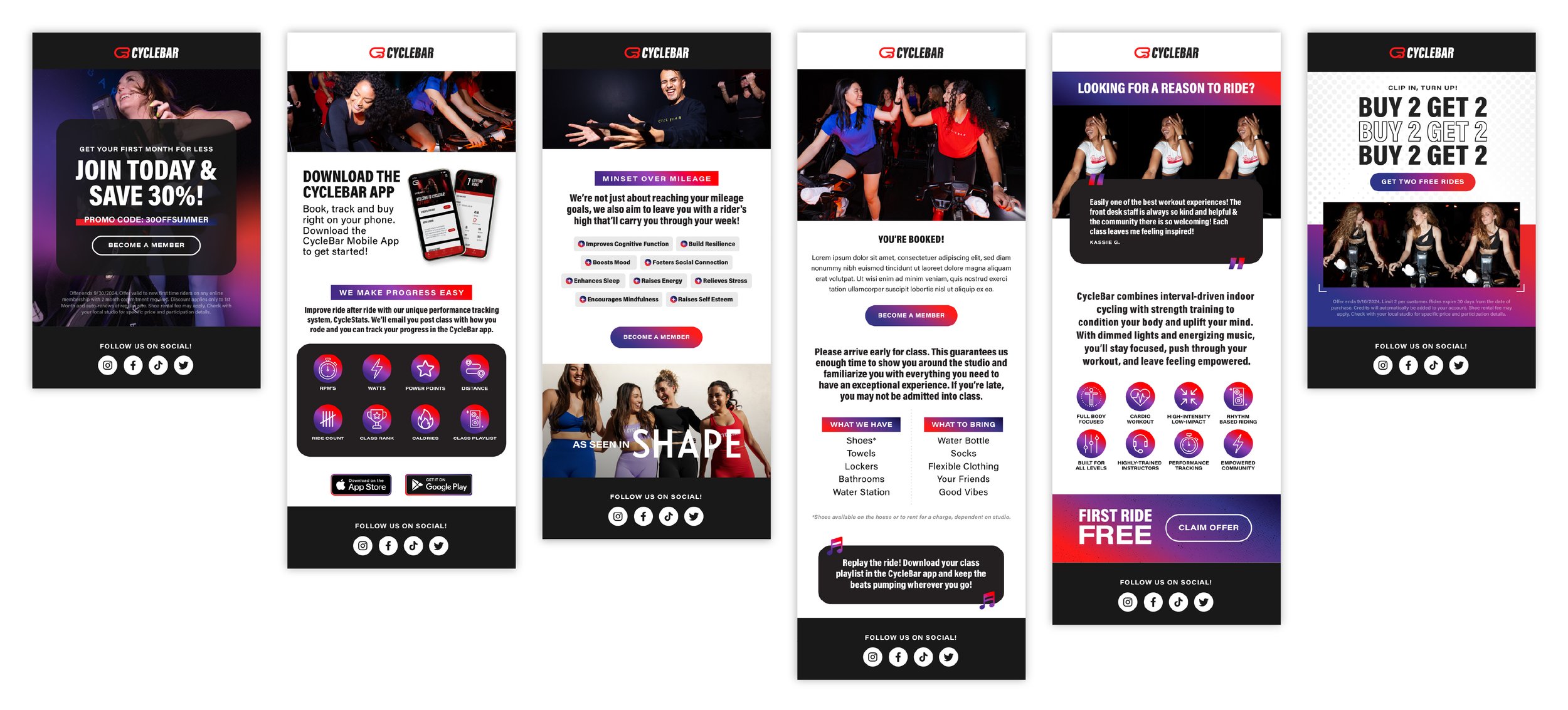 From referrals, to sales plays, to app promotion, we rolled out build-your-own email kits so franchisees could mix and match content to fit their studio needs. Individual graphics can be stacked together to create one easy to use, cohesive, on-brand, email in a matter of minutes. The cherry on top was introducing more educational components like health benefits, class prep breakdowns and how to track your progress that would help guide the audience towards the call to action.